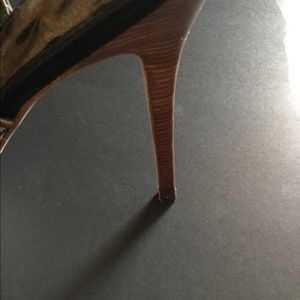 5 1/2” heel, 1.5” platform. Leather peeling by the adjustable buckle, which is not noticeable while wearing, & a small heel repair on the inside right by the heel cap.