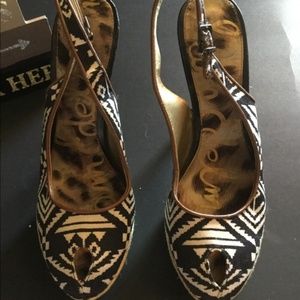Slingback, adjustable strap, peep toe, and jute wrapped platform.