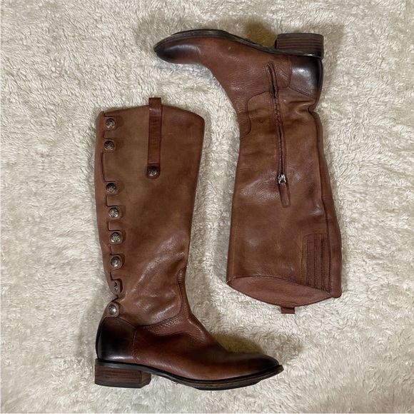 Stylish brown knee-high leather boots featuring button details and side zippers. Perfect for a chic look.