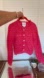 Chic pink cardigan with button closure. Features a textured knit and front pockets. Perfect for layering