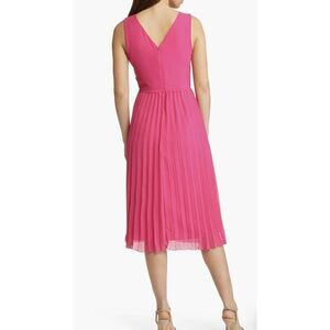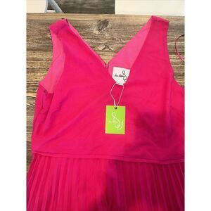 This beautiful Sam Edelman dress in vibrant fuchsia is perfect for any occasion. The sleeveless, V-neck design with pleated accents and a midi length A-line skirt is both elegant and casual, suitable for work or a party. The dress is made of lightweight chiffon fabric with a zip closure and is lined for extra comfort.