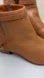 This camel colored ankle bootie has a spur harness resting atop a quilted heel. Boot features a stacked heel, almond toe, and interior side zippers. Wrap around strap with buckle at top of shaft. Topstitching across top of toe.