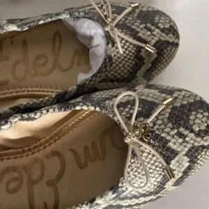 Elegant flats with a stylish python pattern. Features a blend of gray and cream tones. Perfect for versatile wear.