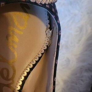 Sam Edelman Rafaella printed pointed toe flats with beaded eye on each toe. So fun and unique looking! Leather sole, fabric upper.