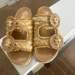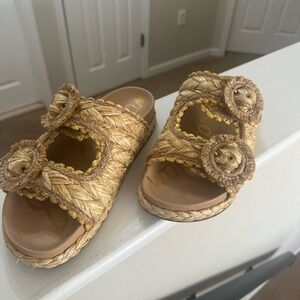 Stylish and comfortable Sam Edelman raffia sandals in a natural tan color. Perfect for everyday wear.