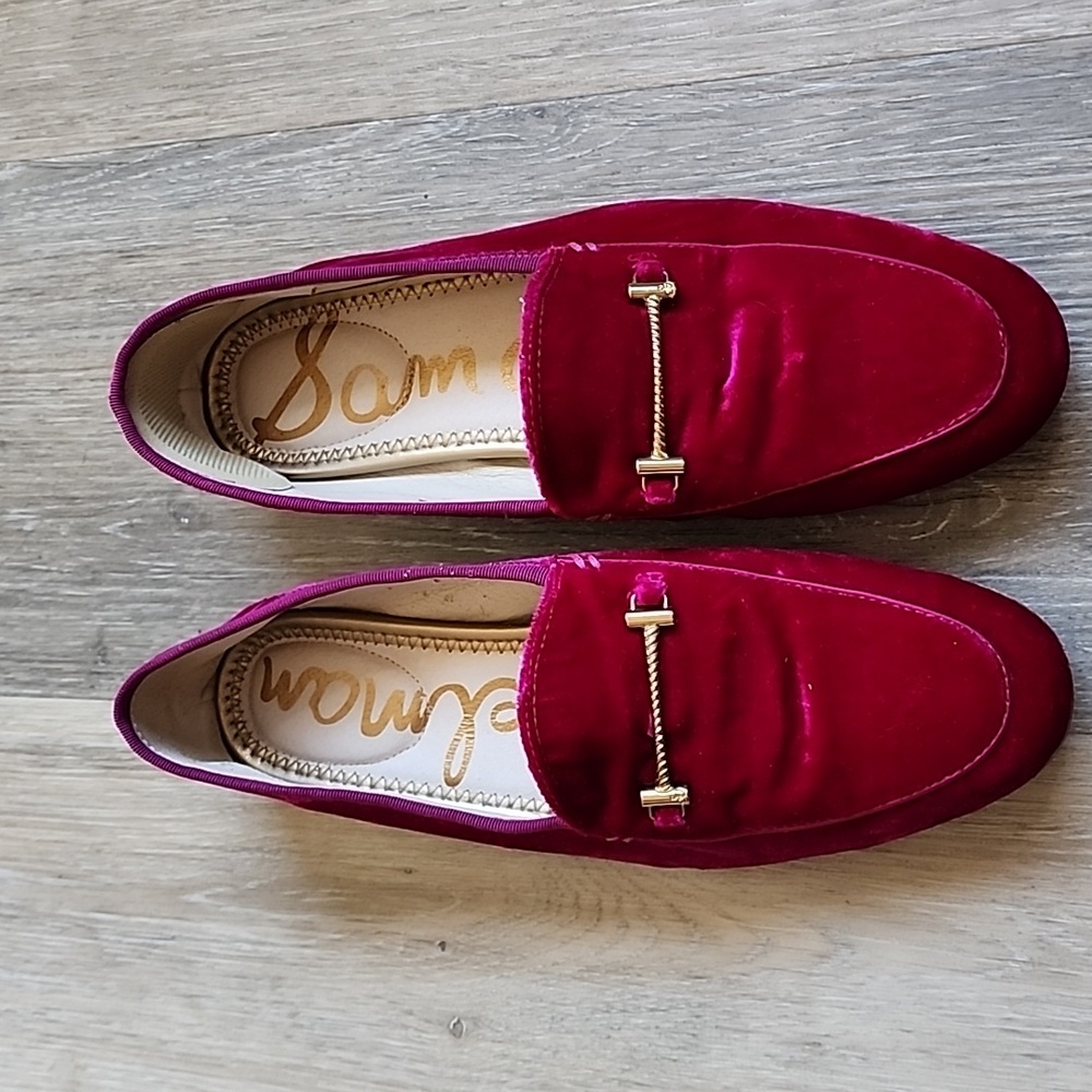 Elegant Raspberry velvet loafers with gold accents. Perfect for a chic look.