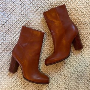Cognac/Rust color, genuine leather, with an inside zip and 3 3/4 inch heel.