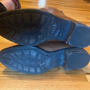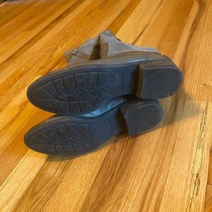 Suede and Smooth leather riding boots. These are gently worn and some of the leather on the inside is broken (which can’t be seen when worn) but still very nice. They hug your calf.