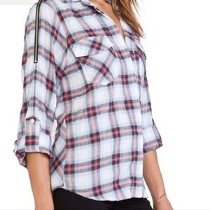 Sam Edelman Plaid Zip Cold Shoulder Split Hem Blouse