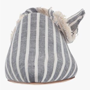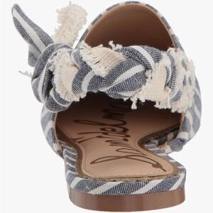 Pointed toe flat with braided slingback strap. Blue/white with canvas fabric upper. Leather sole.