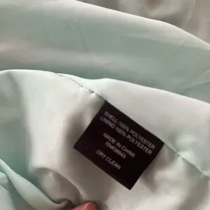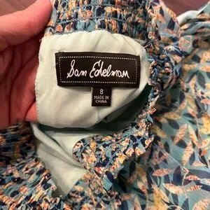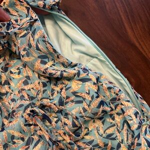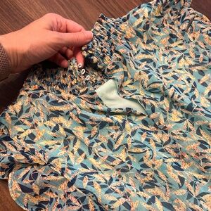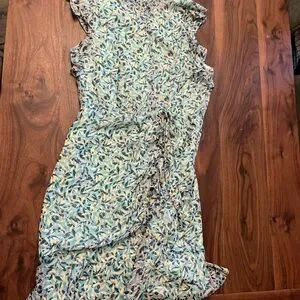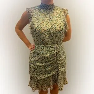 Chic mini dress with ruched ruffles in blue leaf pattern. Sleeveless with a high neckline. Cocktail events. US size 8.