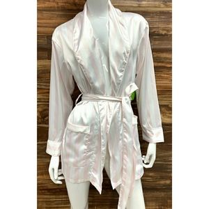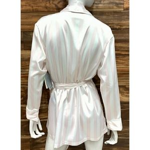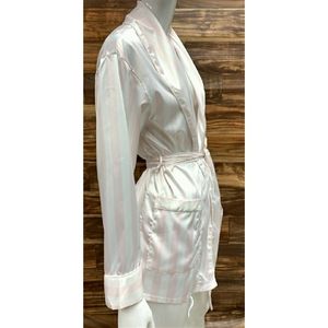 • Refine your home look with this striped pattern smoking jacket that offers just the right amount of warmth and coverage • Featuring; Long sleeves, Baby pink & white stripes, Double front pockets, Waistline belt/tie • Whether enjoying a romantic night in or simply pampering yourself- you'll fall in love with the luxurious satiny smooth material • 97% polyester 3% spandex • Excellent Gift Idea 🎄 •