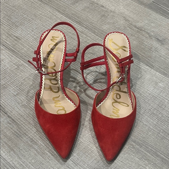 Chic red heels with pointed toe. Adjustable ankle strap. Perfect for a stylish look.