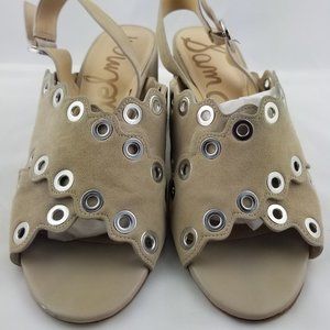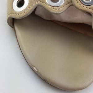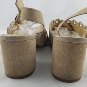 Scalloped trim and bold grommet detail add dynamic style to this bloc heel sandal. Open toe. Criss-cross vamp. Scalloped and grommet embellished straps. Adjustable ankle strap with buckle closure. Lightly padded footbed. Wrapped block heel. Approx. 2.5" heel. Suede upper, synthetic sole. Color is called "Bistro", which is a light taupe/nude color. Excellent pre-owned condition! Very light light scuffs around the back and small imperfection at toe on right shoe - see photo for detail.
