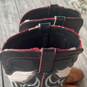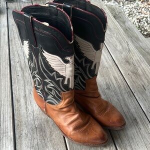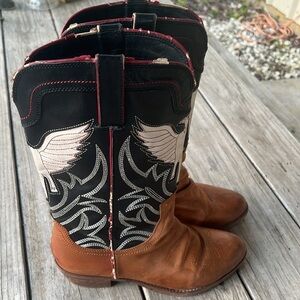 Western boots, cowgirl boots, Sam Edelman boots, women’s leather boots, festival boots, rodeo boots, country style, Western fashion, boho boots, black and brown boots, two-tone cowboy boots, phoenix wings bird eagle