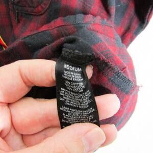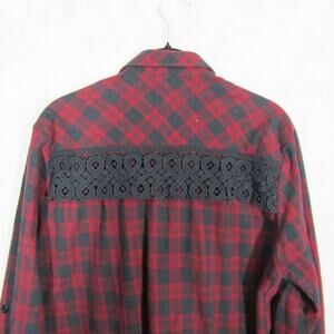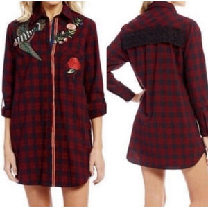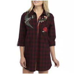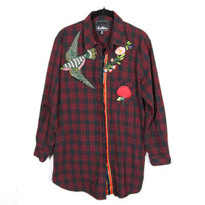 Sam Edelman Shirt Size Medium Tunic Red Plaid Patch Embroidered Plaid Shacket
