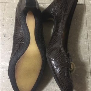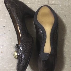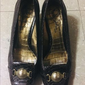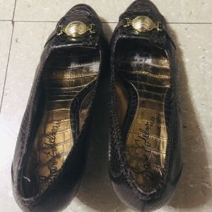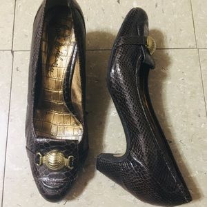 Trendy designer Sam Edelman embossed snake skin leather gold medallion high heel loafer shoes, with gum rubber material outer sole , in like almost new. There is marking on inside and from trying on . These are mark a size 10, and seem true to the size. The color is a rich chocolate brown, and the gold medallion enhances the already beautiful crafted shoes. The soles makes this a very comfortable shoes for walking . Measurements: Outer soles. Heels