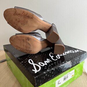 Sam Edelman Odele silver/grey satin heels. Peep-toe heeled sandal with wraparound ankle strap to tie into a bow. Lined insole. 3.5 inch heels.
