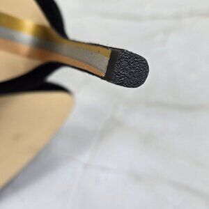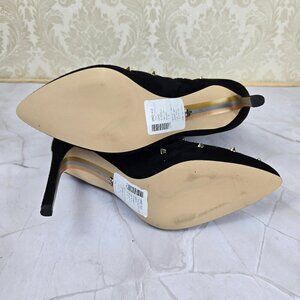 Black suede leather boots have pointed silver stud embellishments all over. Stiletto heels. Pull on style. Pointed toe.