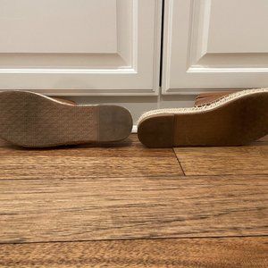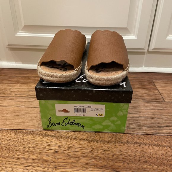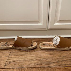 These are camel leather slides with an espedrille style sole.. They are size 9 medium and have not been worn very much.