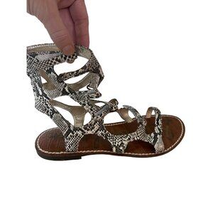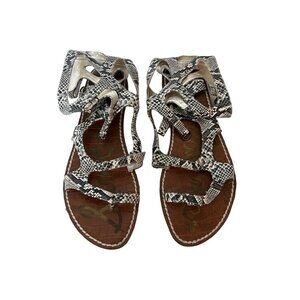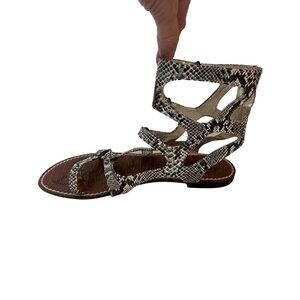 Stylish snake print sandals. Strappy design. Comfortable fit.