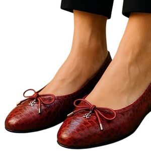 Experience the perfect blend of style and comfort with these Sam Edelman red snakeskin flats. Featuring a flexible design and a lustrous finish, these shoes are ideal for casual outings. Their soft, pliable construction makes them easy to pack and a versatile addition to any wardrobe. 1/4” flat heel Pre-Owned very good quality & condition
