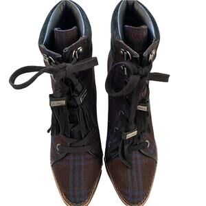Navy plaid victorian inspired bootie. Lace up vamp. Suede quilted padded cuff. Stacked 4" heel. Size 7. NWOT. Retail = $225