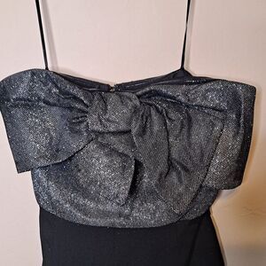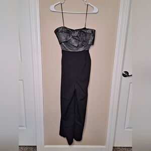 Chic strapless jumpsuit with a statement bow. Features a textured gray top and sleek black pants. Ideal for stylish evenings….And Holiday parties! This is brand new!!! I love it just don’t have the “upper build” to pull it off 😉