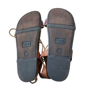 Embrace the summer vibe with Sam Edelman's stylish sandals, featuring a chic strappy design in rich brown and vibrant red hues. These sandals are crafted with attention to detail, offering a comfortable flat sole and eye-catching ankle ties adorned with decorative tassels. Perfect for casual outings, they combine elegance and comfort effortlessly.