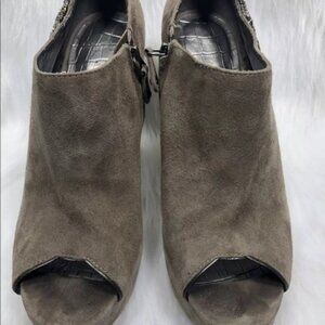 These Sam Edelman platform booties are in excellent condition. Please see photos. They are a taupe suede leather upper with metallic colored beads creating a design on the outer sides of the heels. All the beads are secure. The zippers are on the inside of the bootie and both work very well. They also have a silver metallic treatment on the inner side of the heel which wraps around to the outer side of the heel for about 1/8" inch. Super stylish and comfy. From non-smoking, non-pet home.