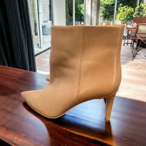 Elegant tan ankle boots with sleek design. Features a pointed toe and side zipper.