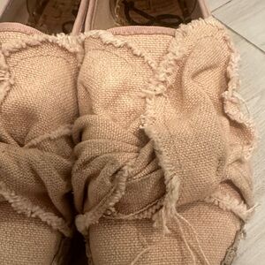 Chic espadrilles with ruffled canvas design. Perfect for casual wear. Adds a stylish touch to any outfit. Pinkish canvas color. In great condition but a little dirty.