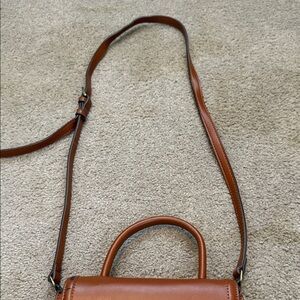 Chic tan satchel with a stylish handle. Features a sleek design and signature logo. Detachable strap for a cross body look. In new condition except for small peeling on the top left corner. See photos.