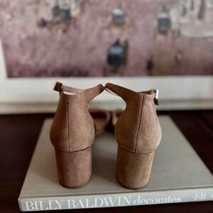 Stylish tan suede block heel sandals with ankle strap. Perfect for any occasion.
