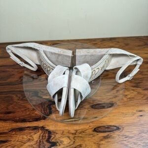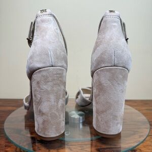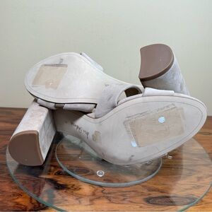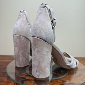 Elegant tan suede heels. Features ankle strap and block heel. Perfect for any occasion. Please note sticky area on shoe in pic. Never worn, in excellent condition.