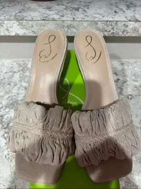 Stylish ruffled single-strap slide mules by Sam Edelman. Square toe with textured fabric upper. Padded insole for comfortable wear. Neutral taupe pairs easily with many looks.