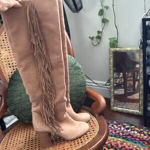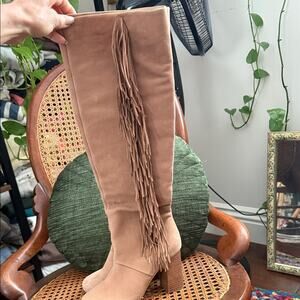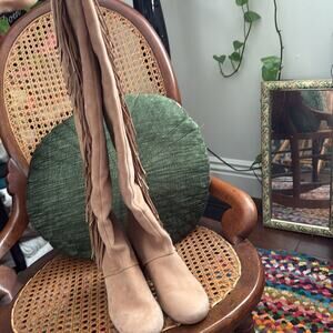 Tan nubuck leather. Fringe detail. Pull on. Stacked heel. US Size 5.5. Rub mark on inside of left boot, possible water mark on inside of right boot, and small spot of peeling on inside top of right boot lining - see pics. No outer rips or tears. Measurements are approximate.