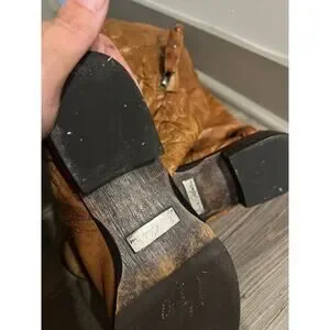 In good condition. Great design. Textured top of the boot. Barely worn, has some spots of discoloration on one side of the boot. Interior has some light peeling which is pretty common for this brand. Zipper is a little sticky. Size 7.5