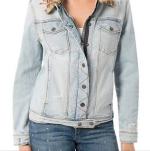 Size S, distressed denim jacket in a light wash. 2 breast pockets. 2 pockets at the hip. Zip and snap closure.