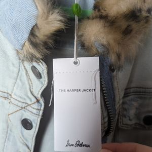 A faux fur collar in a trendy animal print elevates a lightly distressed denim jacket, perfect for adding an edgy-chic vibe to any ensemble.