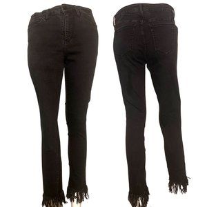 Extra high-rise, slimming black jeans with unique distressed fringes on the hem. The perfect go-to pair of jeans that can transition with tank tops for the summer and sweaters for the winter. They are light-weight and stretchy.