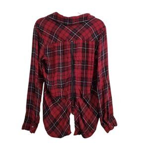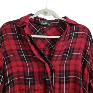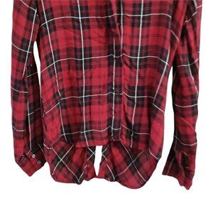 Sam Edelman Plaid Top Womens Red Hi Lo Button up Roll Tab Sleeve Zip Back.