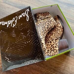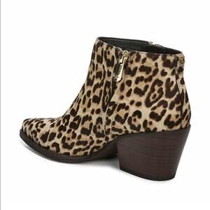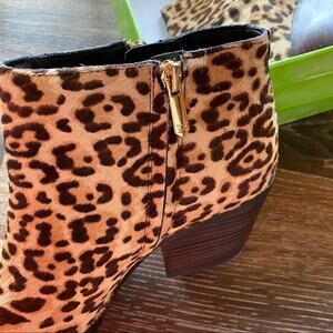 Pointed toe, dual side zip closure, genuine leopard print calf hair upper, synthetic lining and sole. Block heel, approx 2.5".