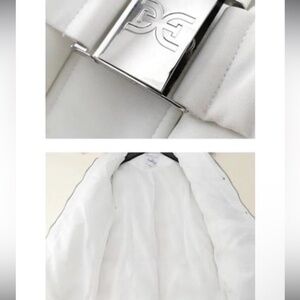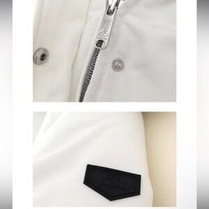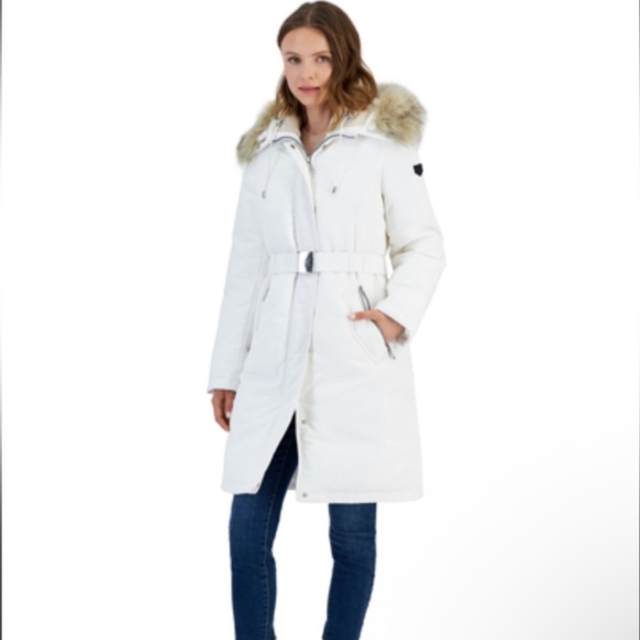 Stylish white parka with fur-trimmed hood. Belted waist for a flattering fit. Perfect for cold weather.