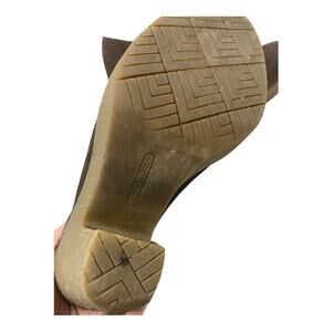 Please see pictures for flaws, there is an indent in the right heel and the platform has some very light coloration.