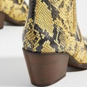 Western inspired details. 2.5” Stacked, chunky heel. Yellow snake print.