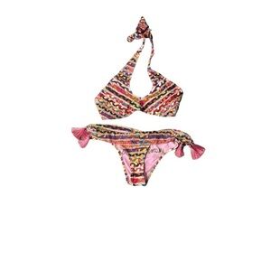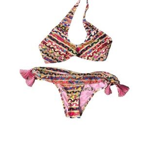 Get ready for a day at the beach with this stylish Sam Edelman Wireless Bikini Swim Top and Bottoms in size S. The braided pattern and multicolor design add a unique touch to this classic bikini set. The top features a halter strap and ties at the neck for a comfortable fit, while the bottoms have a bikini style and are lined for added comfort.