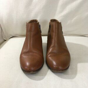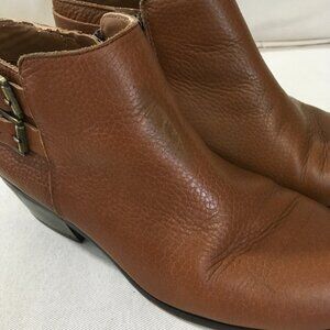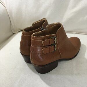 Light brown Sam Edelman ankle boots with two buckle accents and side zipper closure, size 7. Top edge has some peeling (See last 2 photos). Small scuff on upper front, nothing major, still a great boot. Message me with any questions.