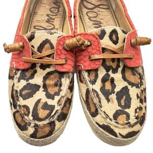Pre-owned women’s Sam Edelman Sebastian leather and fur leopard print slip on boat shoes with suede crocodile skin and espadrille accent detail. A statement piece to add a bold splash of color and flare to your wardrobe.