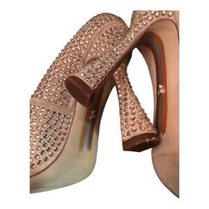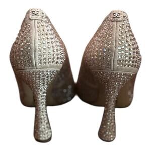 Sam Edelman's Antonia pumps pair elongated with shimmering rhinestones. 4-1/4 flare heel. Pointed toe slip on pumps. Allover rhinestones detailing. Fabric upper; manmade lining: rubber sole.